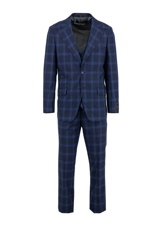 Tiglio Luxe Navy with Light Blue Windowpane Prosecco, Modern Fit Pure Wool Suit & Vest TL5104