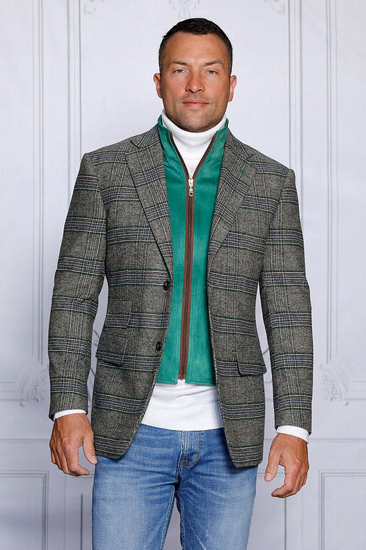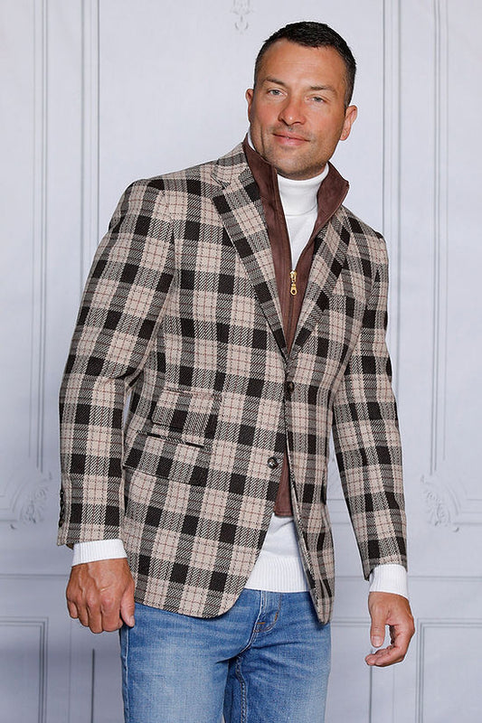 MANZINI MZW-536 Taupe Tailored Fit Faux Wool Plaid Blazer Coat Zip-Out Liner
