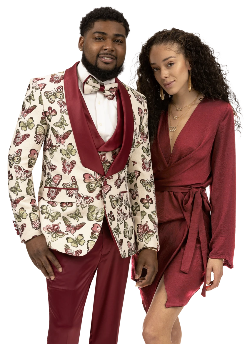 Cream blazer and vest ,with wine and green butterflies. Wine lapel