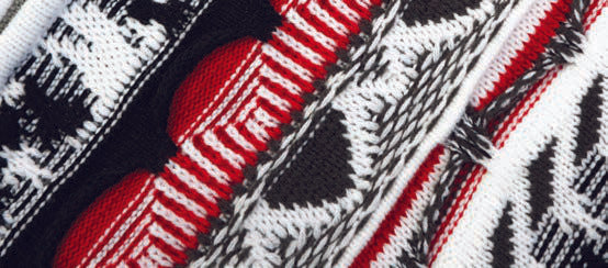 Full zip cardigan with laydown collar with a graphic vertical stripe jacquard pattern on the front body panel. Yarn is made of a high-quality synthetic blend. The center front with metal zipper closure.