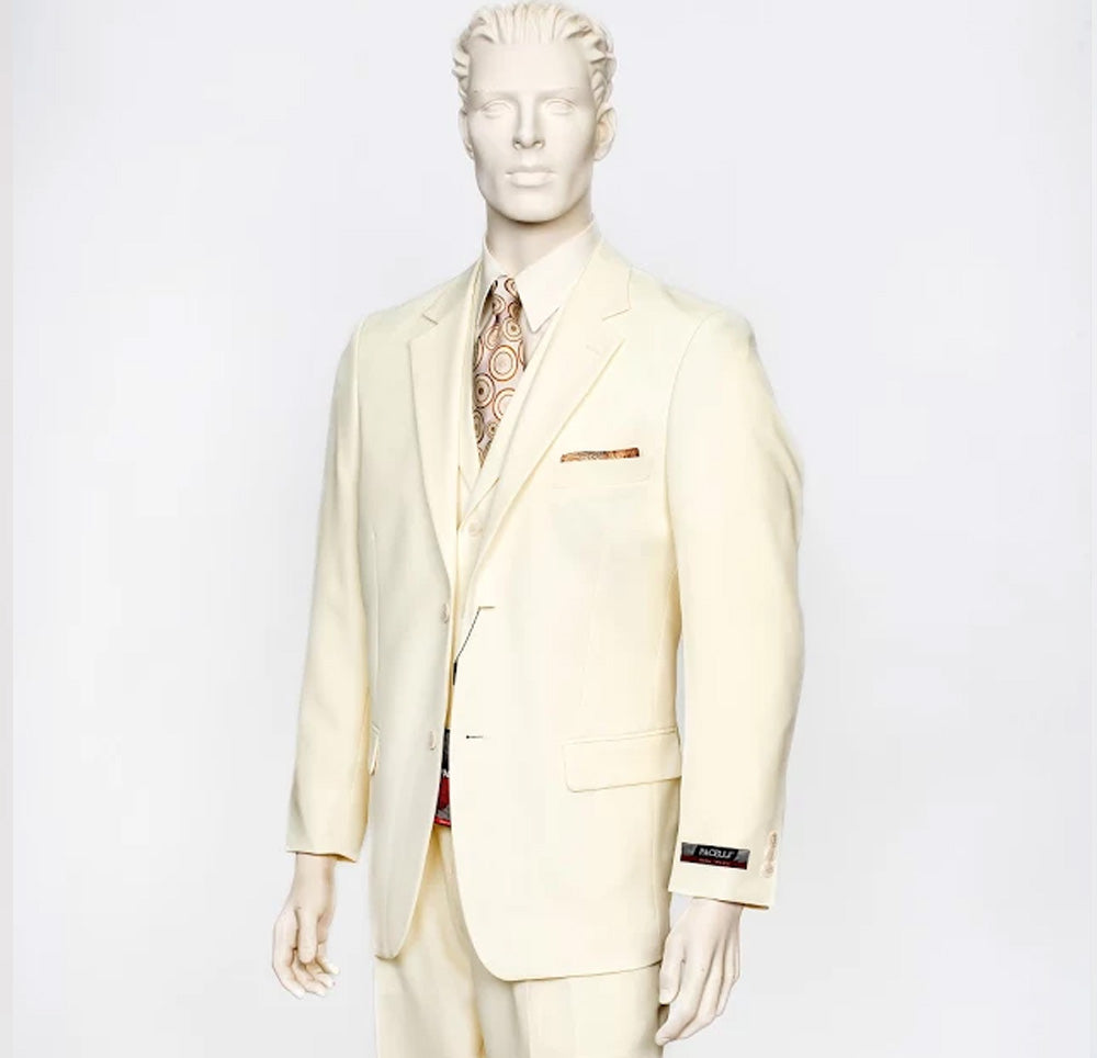 Men's Pacelli 3pc style Camero. Jacket is 2 button with notch lapel and full side vents. Pants are regular fit. Vest has lapel. Made for high fashion and durability blended fabric. Styled in Italy