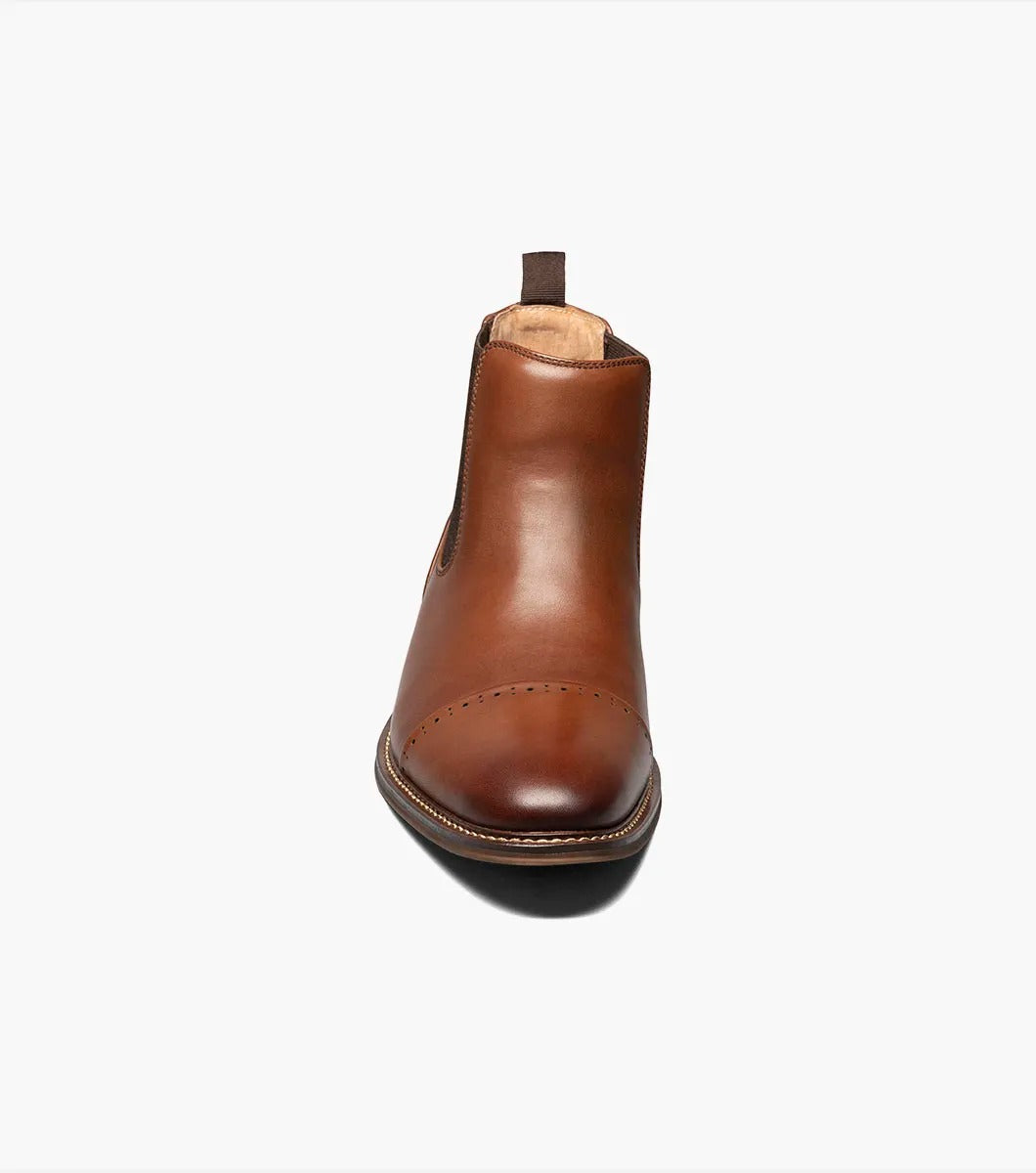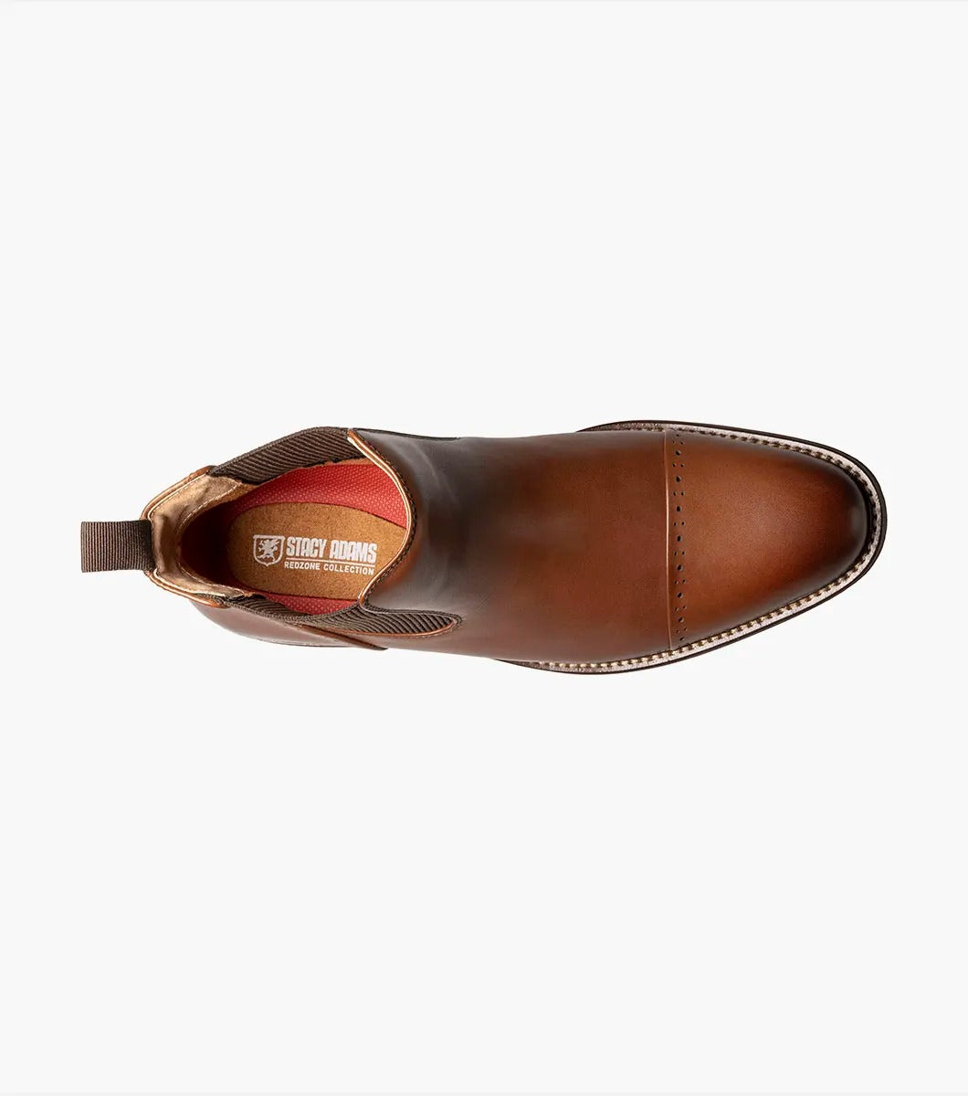 A slip on boot with a perfed cap toe and stacked heel, the Stacy Adams Maury Cap Toe Chelsea Boot is a stylish addition to any collection. Featuring a richly burnished leather upper and stitched welt, it also has the comfort of our removable RedZone insole with molded heel cup that provides anatomical arch support.